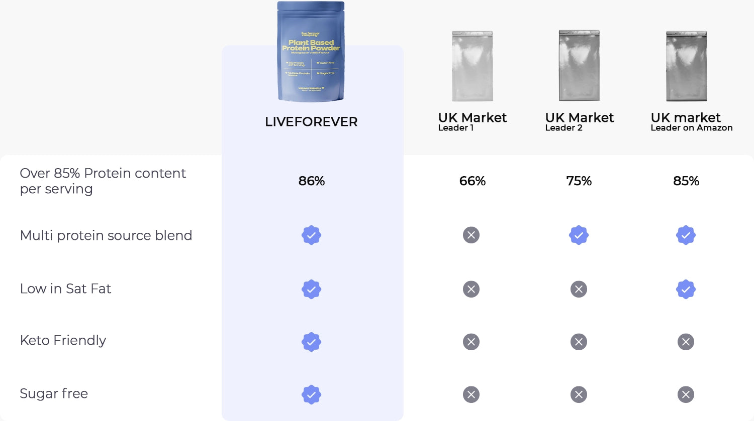 • High protein vs competition (26g per 30g serving)